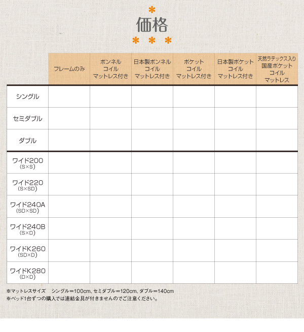 ご使用の際には必ずスプリング入りのマットレスを乗せてご利用ください。それ以外の方法でご使用頂いた場合、製品上重大な破損を及ぼす危険がございます。