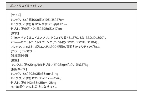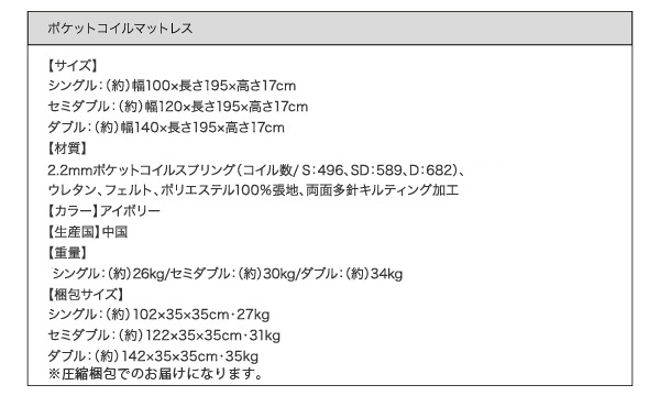 【重量】シングル:26kg/セミダブル/30kg/ダブル34kg