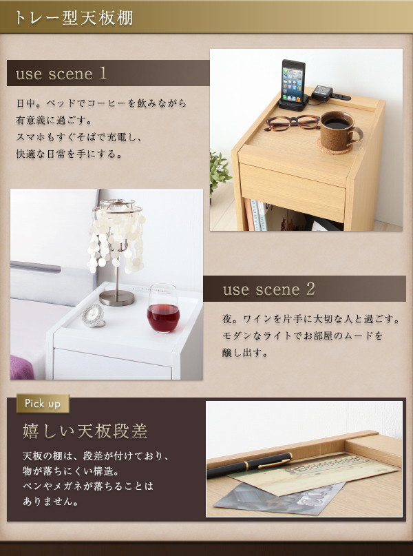 天板は、物が落ちにくいトレー状の段差を設けた構造。
