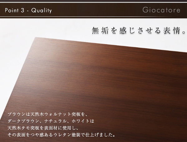 ダークブラウン、ナチュラル、ホワイトは天然木タモ突板を表面材に使用し、