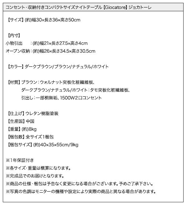 こちらは「【単品】テーブル 幅30cm【Giocatore】ブラウン コンセント・収納付きコンパクトサイズナイトテーブル【Giocatore】ジョカトーレ」の商品ページです。商品画像や説明文には色違いやサイズ違いの商品情報が載っている場合がございます。