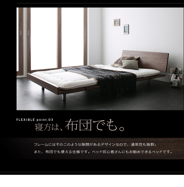 フレームにはすのこのような隙間があるデザインなので、通気性も抜群。また、布団でも使える仕様なので、ベッド初心者さんにもお勧めできるベッドです。