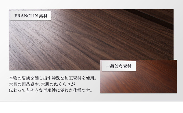 本物の質感を醸し出す特殊な加工素材を使用。木目の凹凸感や、木肌のぬくもりが伝わってきそうな再現性に優れた仕様です。