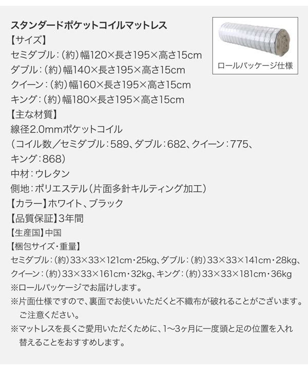 (コイル数/セミダブル:512、ダブル:578、クイーン:644、キング:710)