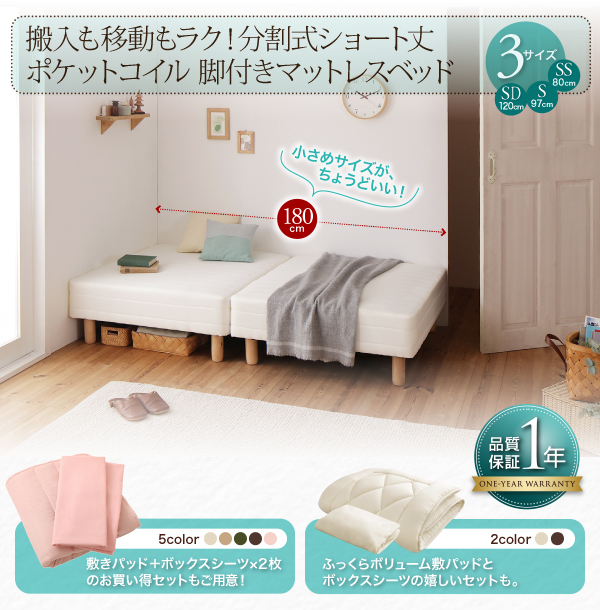 - マットレスベッド シングル ショート丈 脚30cm 【ポケットコイルマットレス】ベッドパッド・シーツセット 寝具カラー:モカブラウン ショート丈分割式 脚付きマットレスベッド