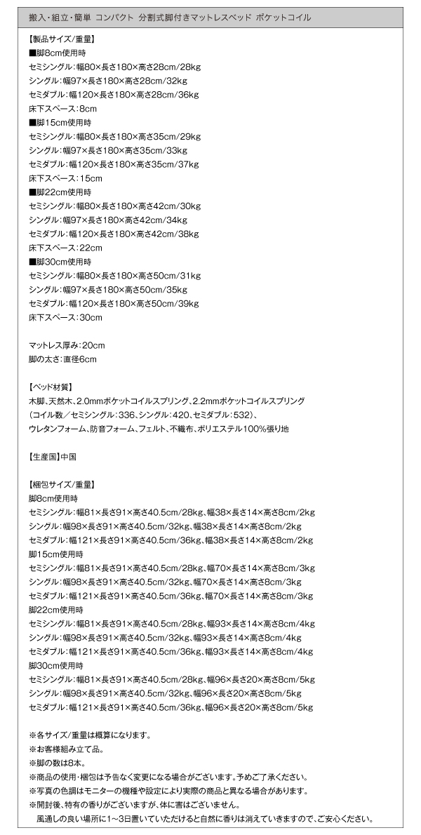 セミダブル:幅121×長さ91×高さ40.5cm/36kg、幅96×長さ20×高さ8cm/5kg