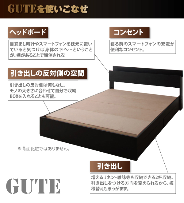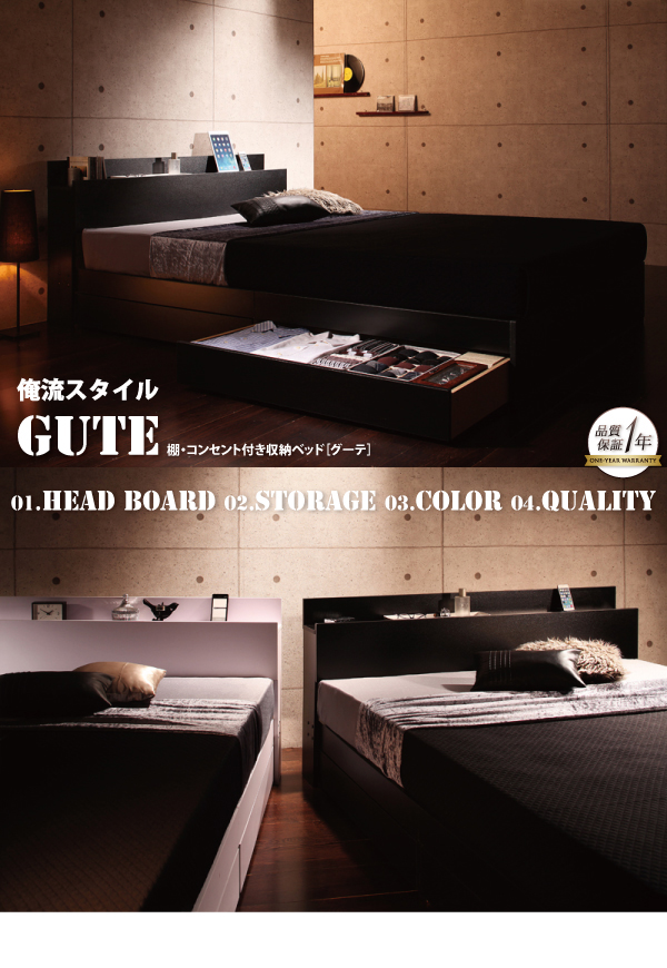 こちらは「収納ベッド シングル 【フレームのみ】 フレームカラー ブラック 棚・コンセント付き収納ベッド Gute グーテ」の商品ページです。