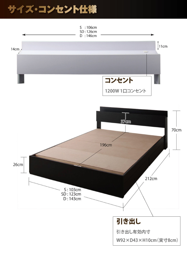 合成樹脂化粧繊維板(ヘッドボード、サイドフレーム、フットボード)、1口コンセント(1200W)