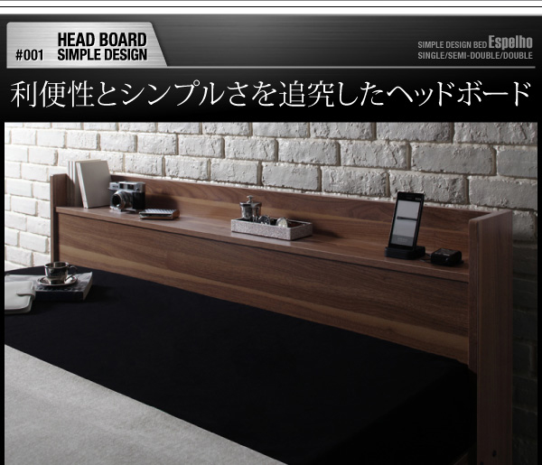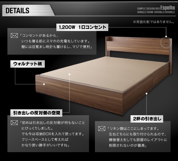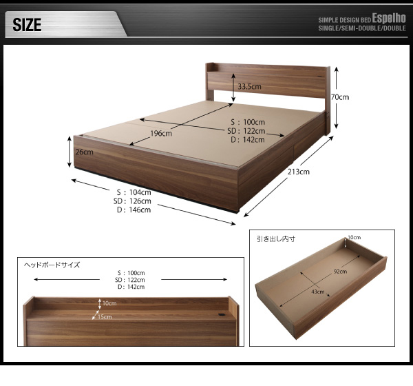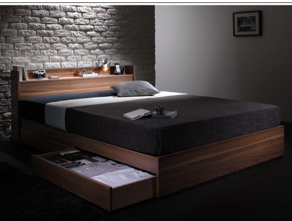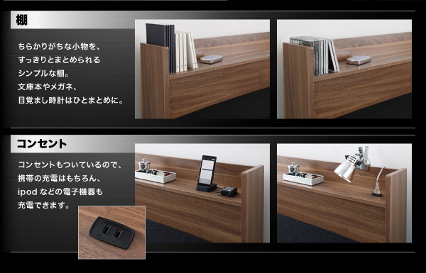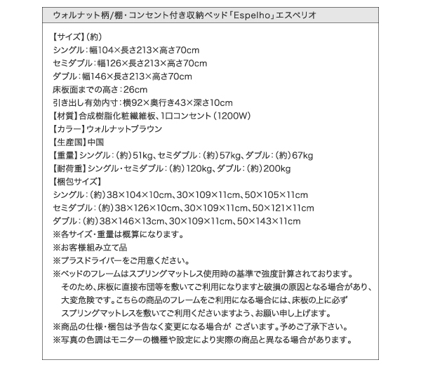 ウォルナット柄/棚・コンセント付き収納ベッド Espelho