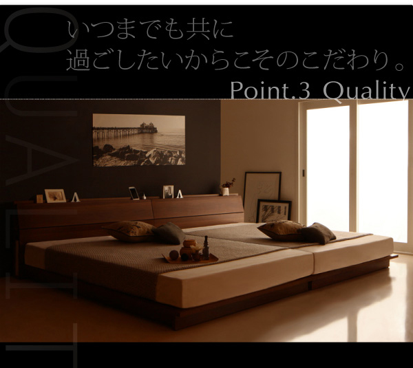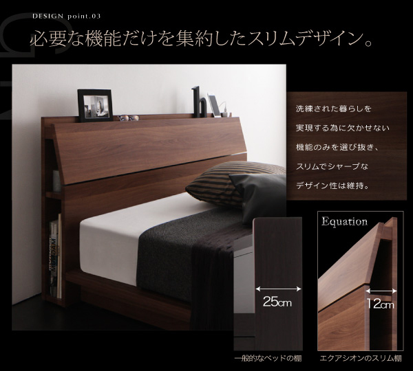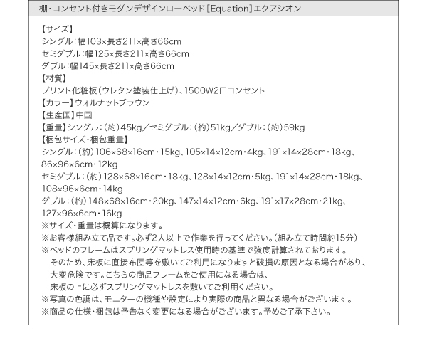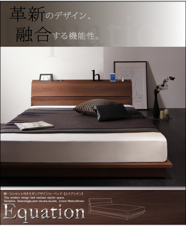 - ローベッド シングル 【プレミアムボンネルコイルマットレス付】 フレームカラー:ウォルナットブラウン マットレスカラー:ホワイト 棚・コンセント付きモダンデザインローベッド Equation エクアシオン