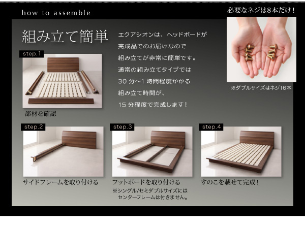 エクアシオンは、ヘッドボードが完成品でのお届けなので組み立てが非常に簡単です。