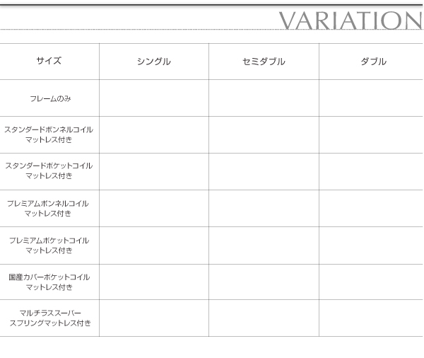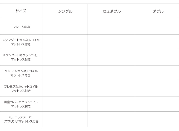 ※ベッドのフレームはスプリングマットレス使用時の基準で強度計算されております。そのため、床板に直接布団等を敷いてご利用になりますと破損の原因となる場合があり、大変危険です。こちらの商品フレームをご使用になる場合は、床板の上に必ずスプリングマットレスを敷いてご利用ください。