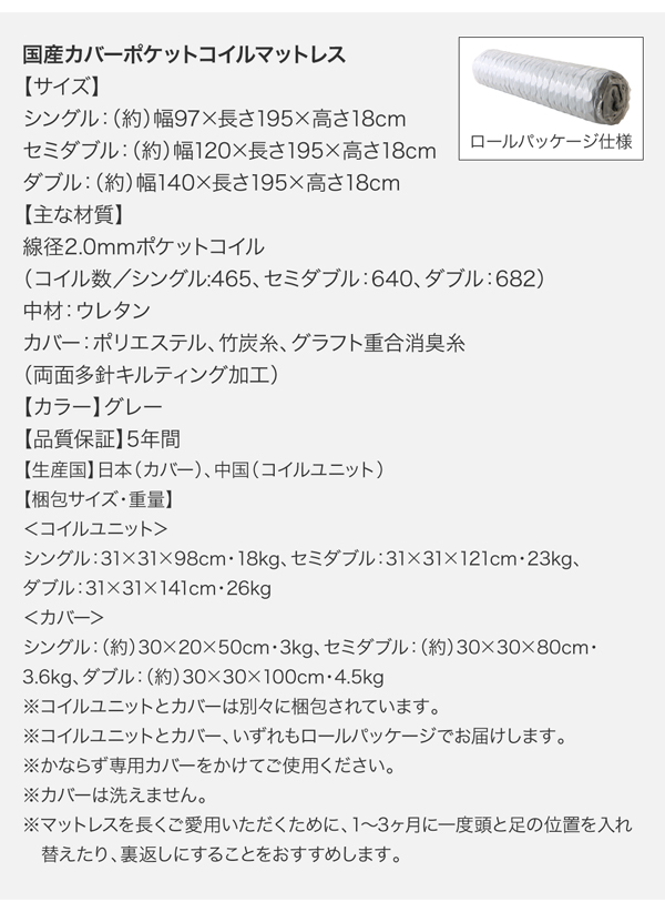 セミダブル:(約)128×68×16cm・18kg、128×14×12cm・5kg、191×14×28cm・18kg、108×96×6cm・14kg