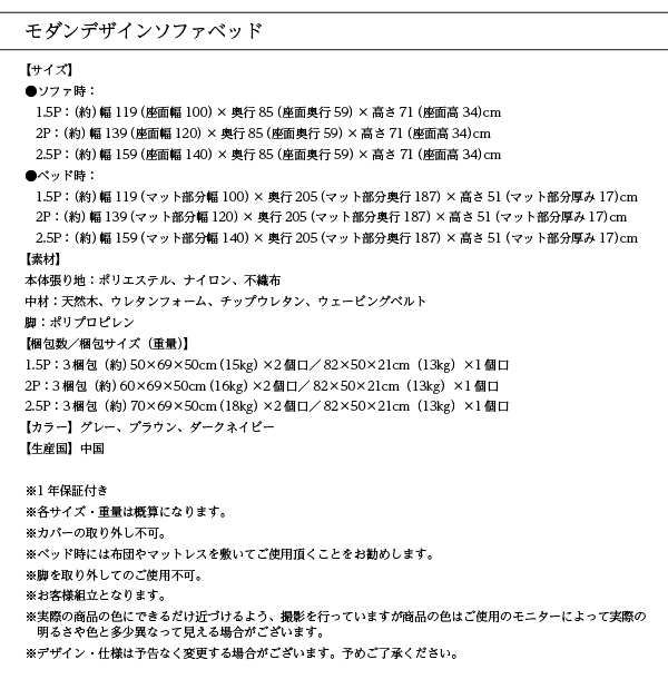 1.5P:(約)幅119(座面幅100)×奥行85(座面奥行59)×高さ71(座面高34)cm