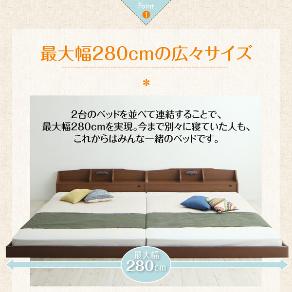 2台のベッドを並べて連結することで、最大幅280cmを実現。今まで別々に寝ていた人も、