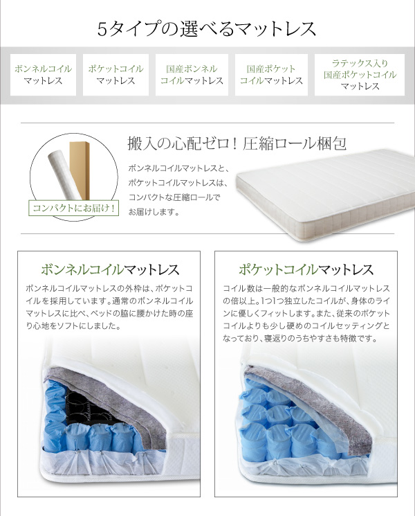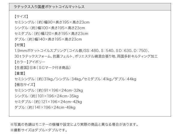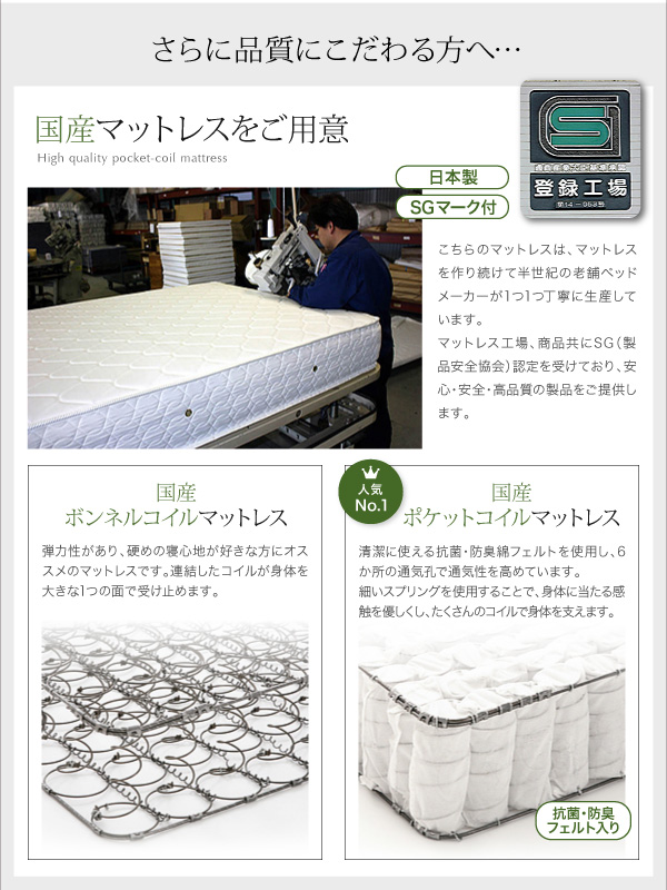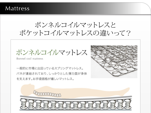2.1mmボンネルコイルスプリング(コイル数/SS:240 S:270 SD:330 D:390)、 2.2mmポケットコイルスプリング(コイル数/SS:88 S:92 SD:98 D:104)、ウレタン、フェルト、ポリエステル100%張地、両面多針キルティング加工