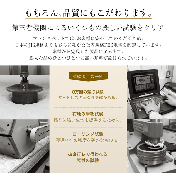 身体でもっとも重いお尻の位置にあたるマットレスの中心部に約100kgの荷重を8万回繰り返しかけて製品の耐久性を検査しています。